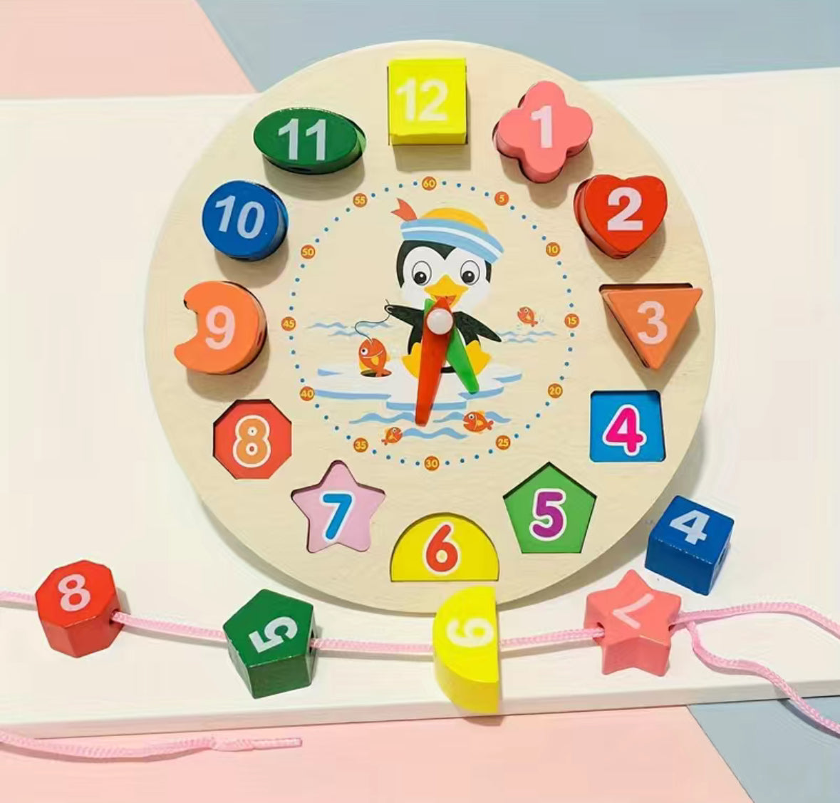 Wooden Montessori toy with 12 pieces for early education in preschool children. Features a clock-style design with numbers 1-12 ⏰. Parental supervision advised due to the presence of a string.