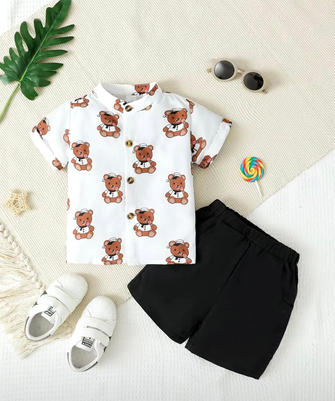 This summer outfit for baby boys is perfect for any outing with its cool bear print shirt and black shorts.